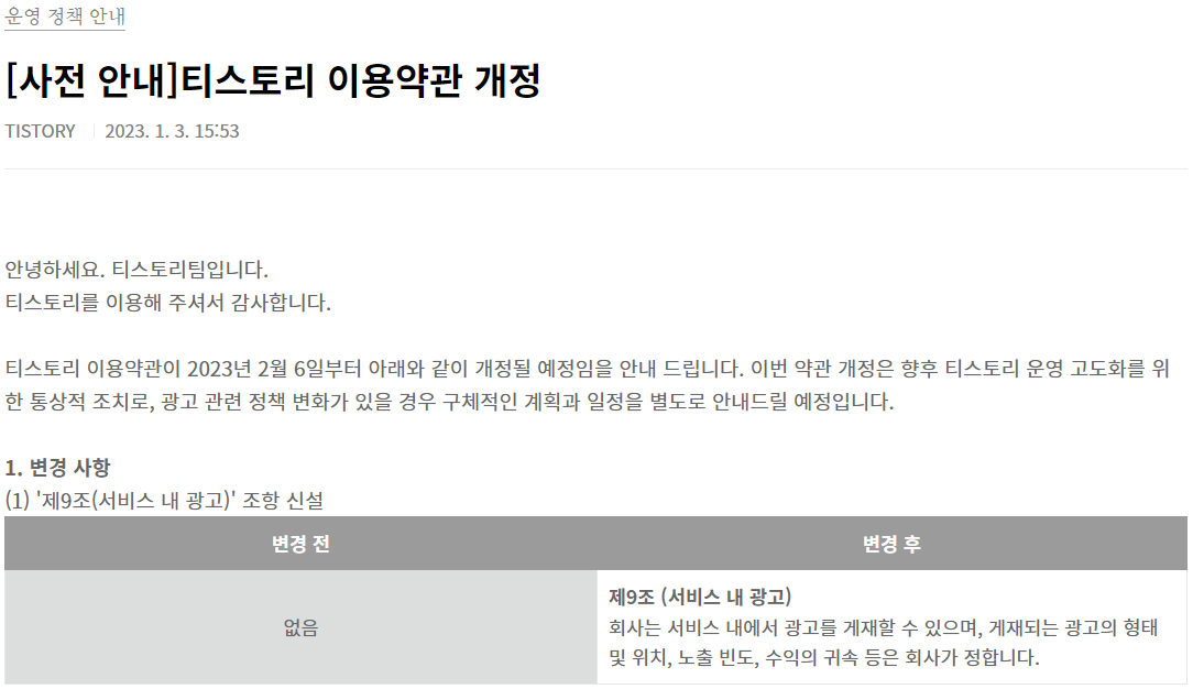 그런데 이번에 티스토리가 이용약관을 개정했는데, 서비스 내에 광고를 삽입할 수 있도록 하는 개정안이 나와서 유저들이 한 목소리로 우려를 나타내고 있다.