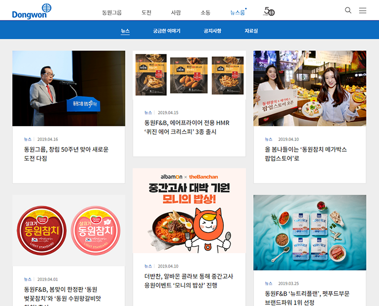 비교적 최근 론칭한 동원그룹 홈페이지는 워드프레스 같은 CMS 플랫폼이 아닌 자체 개발을 진행했고, 내부에 뉴스룸을 두어 브랜드 콘텐츠까지 소화할 수 있게 제작했다. 만약 워드프레스로 구축했다면 RSS 등을 통해 제작된 콘텐츠를 쉽게 내보낼 수 있었을 텐데 별도로 검색 노출을 위한 RSS 시스템까지 장착이 되지는 않은 듯하고, 검색 결과가 후순위로 밀려있는 걸 보면 검색엔진의 크롤링에만 의존해 노출되는 것이 아닌가 한다. 그 부분은 좀 아쉽다. 하지만 괜찮다. 역시 대기업이라 온갖 뉴스 사이트에 홍보기사로 도배시킬 수 있다. 원래 뉴스룸이 받아쓰기 용도이긴 하지만.